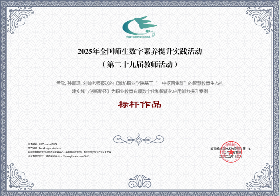 近日,教育部教育技术与资源发展中心(中央电化教育馆)公布了2025年全国师生数字素养提升实践活动-职业教育专项数字化和智能化应用能力提升案例评选结果。全国共评选出标杆作品39项,我院报送的案例《潍坊职业学院基于“一中枢四集群”的智慧教育生态构建实践与创新路径》成功入选。
