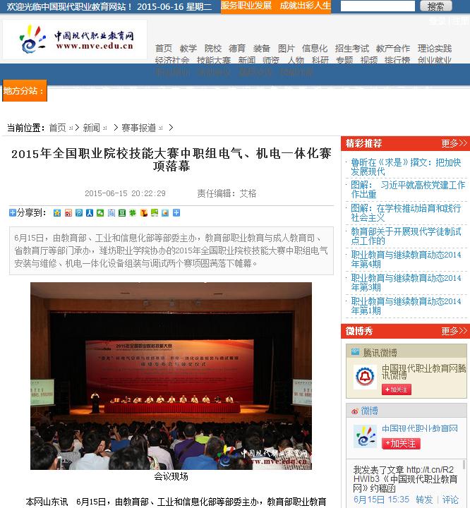 本网山东讯6月15日,由教育部、工业和信息化部等部委主办,教育部职业教育与成人教育司、省教育厅等部门承办,潍坊职业学院协办的2015年全国职业院校技能大赛中职组电气安装与维修、机电一体化设备组装与调试两个赛项圆满落下帷幕。